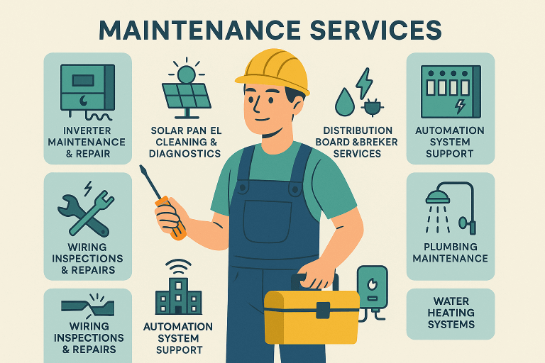 We bring technical expertise, responsive service, and a preventive mindset to every maintenance task. Whether it’s solar, electrical, plumbing, or automation, our skilled team ensures your systems stay safe, efficient, and trouble-free—so you can focus on what matters most.